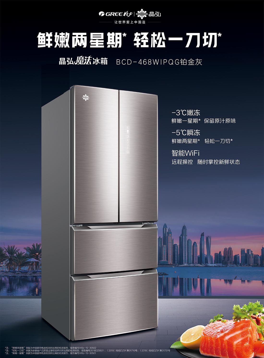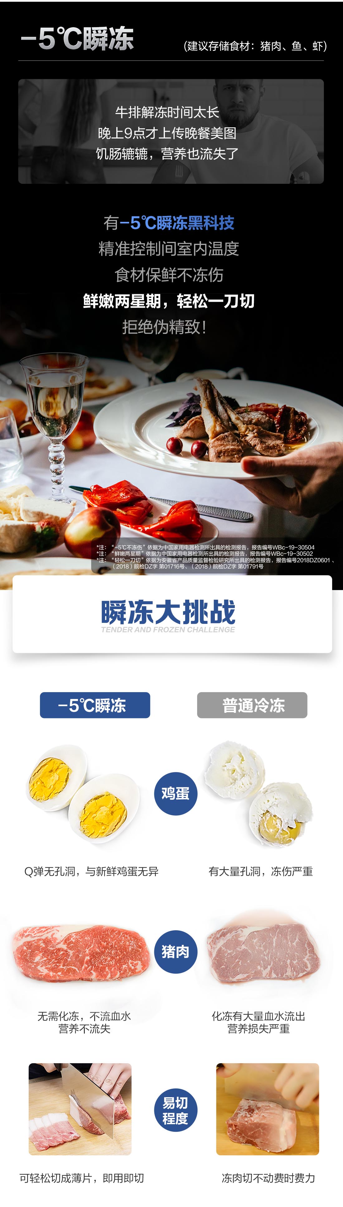 搭載-5℃瞬凍黑科技,鮮嫩兩星期,輕松一刀切。細胞級養鮮,營養流失少。搭載-3℃嫩凍黑科技,食材不結冰,鮮嫩一整周。智能全變頻技術,恒溫保鮮,節能靜音。