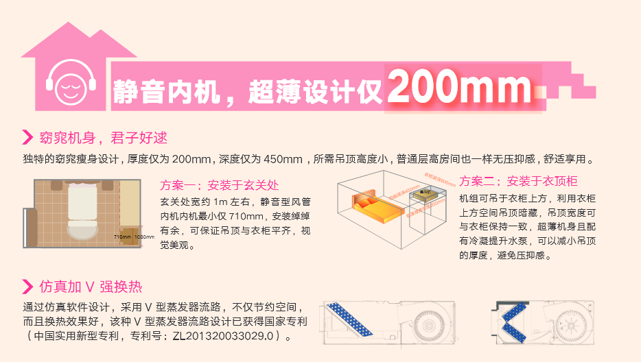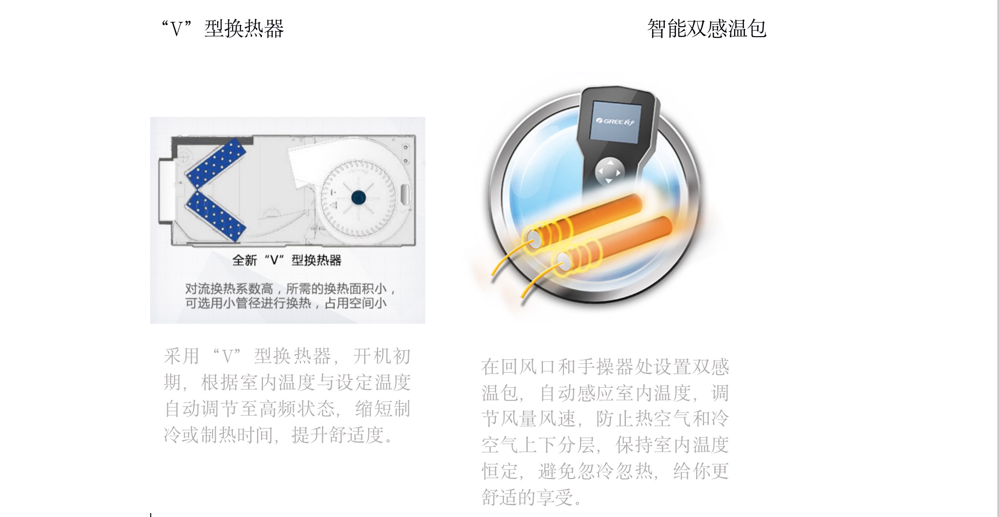 采用“V”型換熱器,開機初期,根據室內溫度與設定溫度自動調節至高頻狀態,縮短制冷或制熱時間,提升舒適度